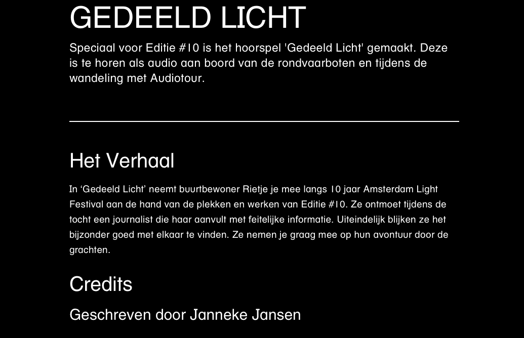 Voor het Amsterdam Light Festival schreef ik een hoorspel van 75 minuten dat op al hun 100 boten te horen zou zijn. Ingesproken door Hannah van Lunteren als de bijdehante gedichtenstem, Sylvia Poorta als buurvrouw Riet en Matteo van der Grijn als journalist. Helaas mochten de boten maar een paar dagen varen en ging het land daarna in lockdown. Van 2 december - 23 januari 2022 was mijn tekst nog wel te horen op Amsterdam Light Festival als je de lichtroute wandelde, wat veel Amsterdammers en mensen van buiten de stad hebben gedaan. Het NRC noemde het een soort bedevaartstocht, een uiting van religie bijna, om samen langs het licht te lopen in donkere tijden.