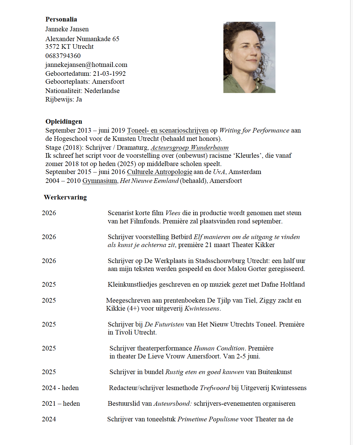 Janneke Jansen (1992) studeerde in 2019 af van de opleiding Writing for Performance aan de Hogeschool voor de Kunsten Utrecht. Ze kwam binnen met een liefde voor Annie M.G. Schmidt en ontdekte de humor en symboliek van Beckett. Ze experimenteerde met taal en leerde dat de vorm van zinnen ook iets zegt over de inhoud. Als schrijver bevraagt ze regels van de samenleving. Ze schreef onder andere met fantasie over de verschillen tussen arm en rijk en wat als gek en normaal wordt gezien.