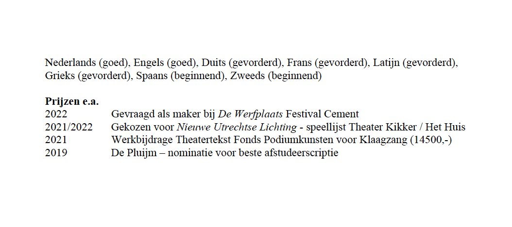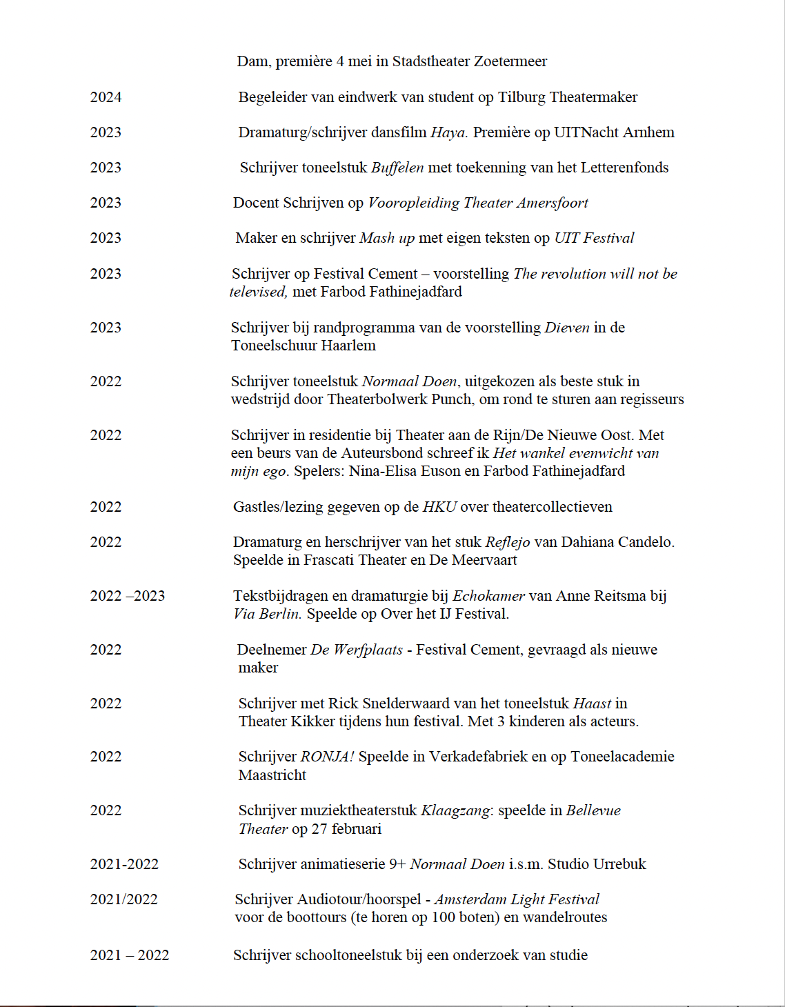 Ze liep schrijf- en dramaturgiestage bij Acteursgroep Wunderbaum. Daar leerde ze de meta-lagen te doseren en concreet en grappig te houden, naast het filosofische en de verdieping. Ze schreef voor (muziek)theater, jeugdtheater, podcasts, deed interviews voor Theaterkrant en werkte voor Theaterkrant Magazine en Dolle Mina’s magazine MINA. Ze werd bestuurslid bij de Auteursbond en genoot van het verbinden en bekrachtigen van schrijvers.